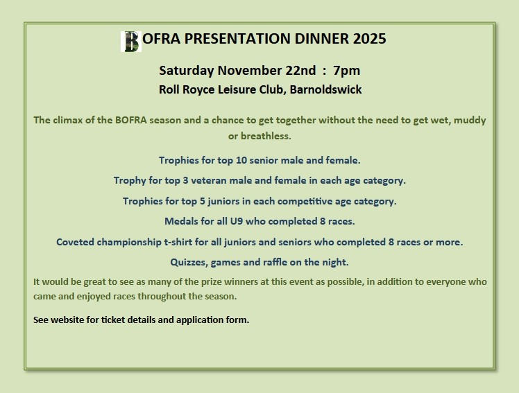 Details of the BOFRA end of season Presentation Dinner are now available. This is an event for both juniors and seniors where we present trophies for the overall championship positions.